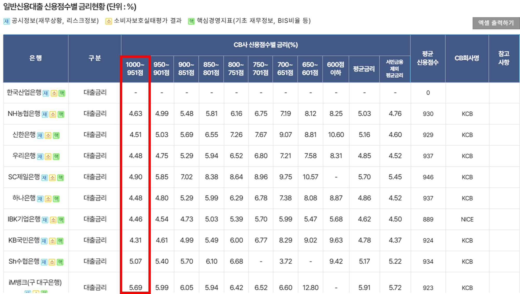 공시자료는 비교공시를 위하여 신용평가회사(CB사)의 개인신용점수를 기준으로 평균금리를 공시하고 있으므로, 실제 대출을 실행할 경우 은행별 자체신용점수가 다르며, 금리, 거래조건등도 다를 수 있습니다. 자세한 사항은 해당 은행으로 문의하시기 바랍니다.