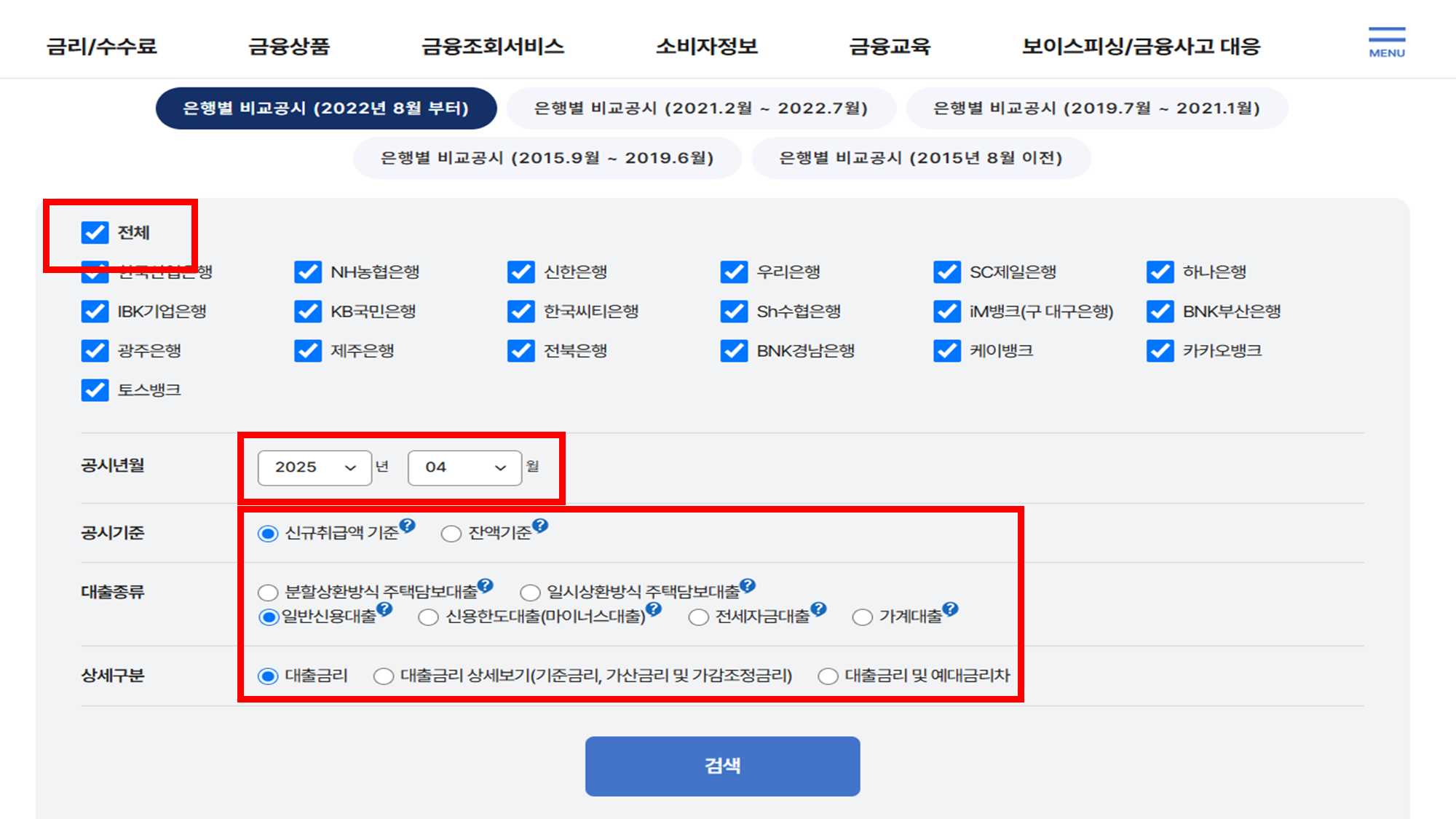 검색은행, 공시년월, 공시기준, 대출 종류(예: 신용대출, 전세자금대출 등), 상세구분 등을 입력하여 조건을 설정합니다.