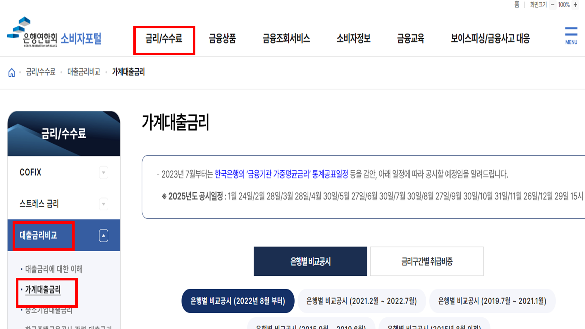 메인 화면에서 '금리/수수료' - '대출금리비교' - '가계대출금리'를 선택합니다.