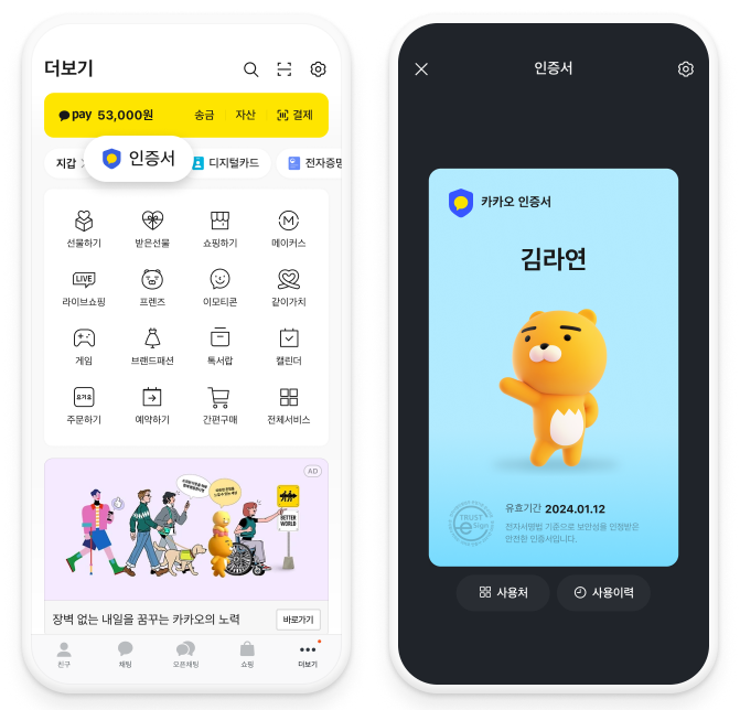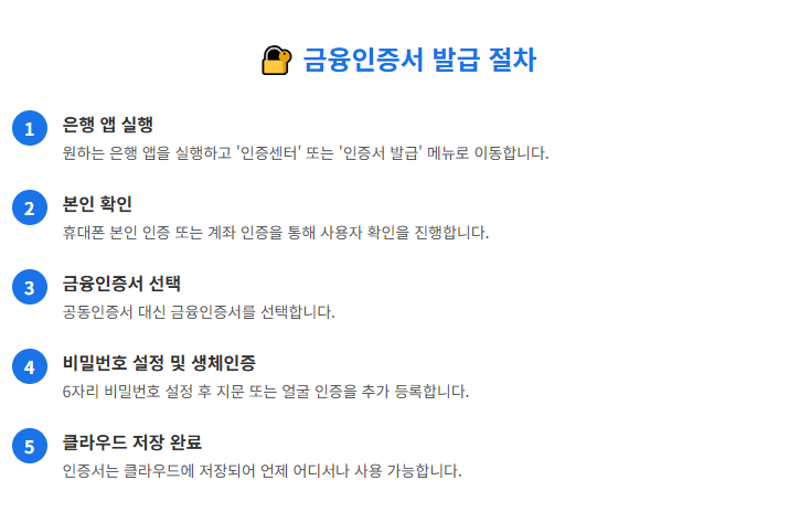 | 발급 주체 | 공동인증기관 | 금융결제원 | 민간기업(네이버, 카카오 등) |