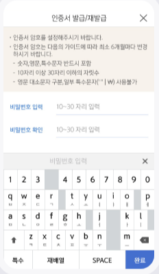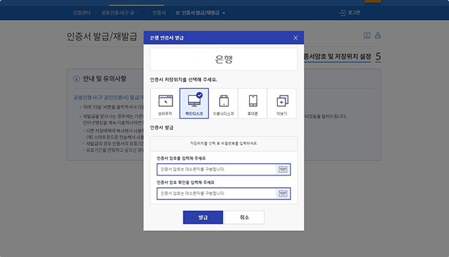 ③ 본인확인 후 신원인증을 마치면 공동인증서 발급이 됩니다. (인증서 암호 설정&저장공간 선택 必)