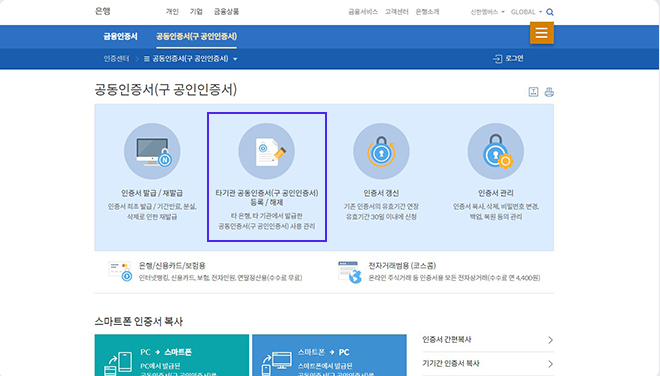 ① 은행 홈페이지로 접속하여, [인증센터] 또는 [공동인증서] 메뉴를 선택합니다.