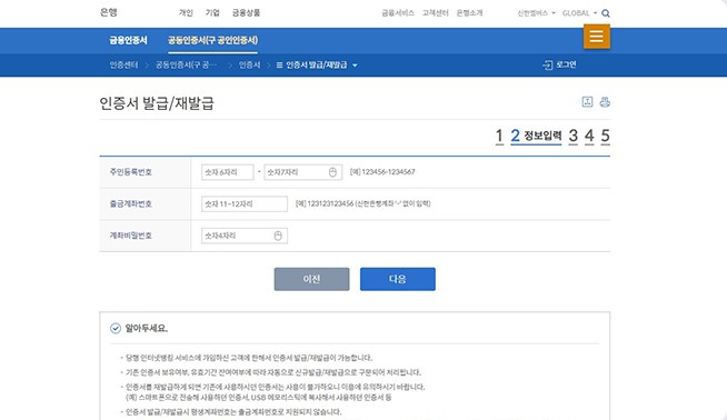 - '공인인증서 발급' 메뉴 선택